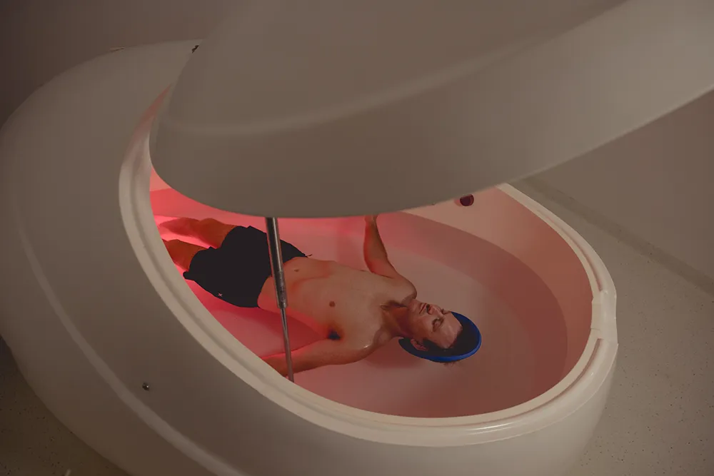 Your journey to float therapy begins by entering a sensory deprivation pod filled with 30cm of water infused with 600kg of magnesium sulphate (Epsom salts), allowing your body to float effortlessly. The water is warmed to outer skin temperature. Each pod is approximately 230cm long by 150cm wide, allowing most people, regardless of their body shape or size, to fit comfortably.